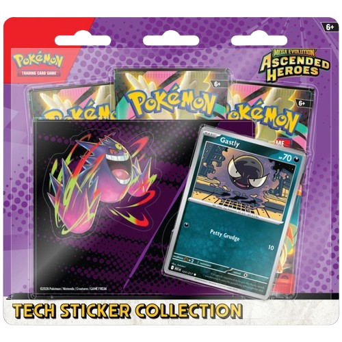 Tech Sticker Collection met een foil promo van Charmander of Gastly, een sticker sheet met de bijbehorende Mega Evolution en drie Ascended Heroes booster packs.